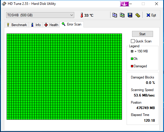 Kõik ruudud on rohelise värviga, mis tähendab, et kõvakettal ei ole ühtegi bad sectoreid.